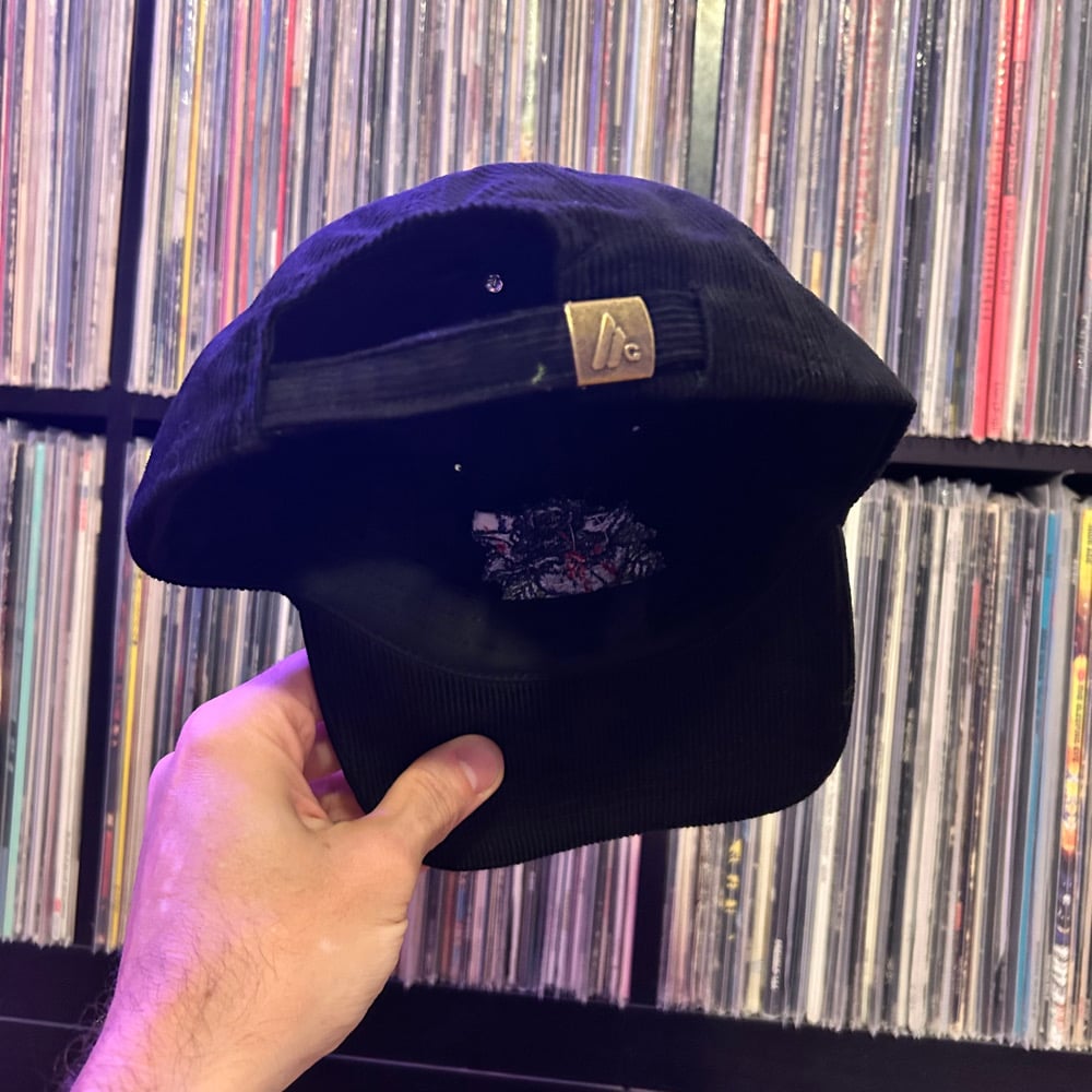 four color embroidered logo on a corduroy megacap with an adjustable brass buckle strap.